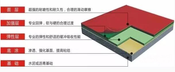 1. 色彩:专用聚氨酯颗粒,表面颜色柔和,颗粒状表层,防止耀眼刺眼阳光的反射,美观耐久,并可采用多色彩搭配。