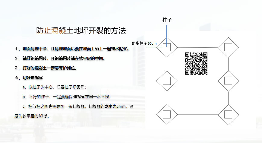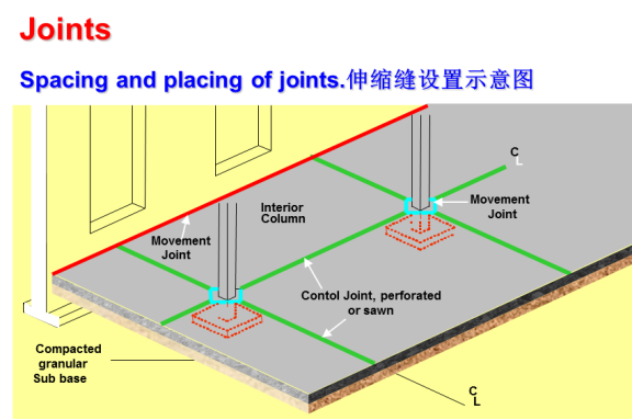 一、准确掌握切割伸缩缝的时机是关键,切早了容易崩边、切完了起不到作用。耐磨地坪的伸缩缝切割的最佳时间即为施工完工后的第二天。除合理掌握时间外,切割伸缩缝的顺直取决于弹线和切割两方面,必要情况下可以借助红外线发射器弹线,挑选技术熟练的工人切割,以此保证切割出来的伸缩缝是顺直的。切割伸缩缝的宽度一般为3-5mm,深度一般为水泥混凝土厚度的1/3-1/2,切割伸缩缝后分隔出的水泥混凝土区域块的长、宽尺寸以6-8m为宜(同时根据框架柱的距离调整修改切缝尺寸),可以按柱距或设计图纸要求为准。切割应统一弹线,以确保切割缝整齐顺直.