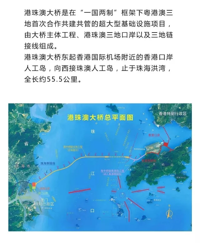 港珠澳大桥全长55公里,包括海中桥隧主体工程、三地连接线及口岸,是目前世界最长的跨海大桥。